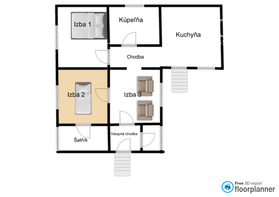 Dispozícia domu:chodba, komora s výstupom na terasu, 3 izby, kúpeľňa, chodba, kuchyňa