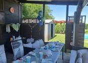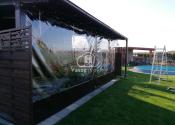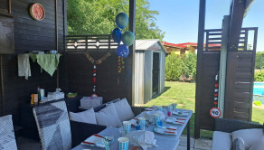 Terasa je vybavená betónovými dlaždicami a vonkajším posedením, ktoré je možné ochrániť priehľadnými rolovacími plachtami. Led osvetlenie okolo terasy vytvára príjemnú atmosféru počas večerných posedení. Okolo terasy je aj daždová clona , ktorá je veľmi príjemná pri teplotách nad 30 stupňov .