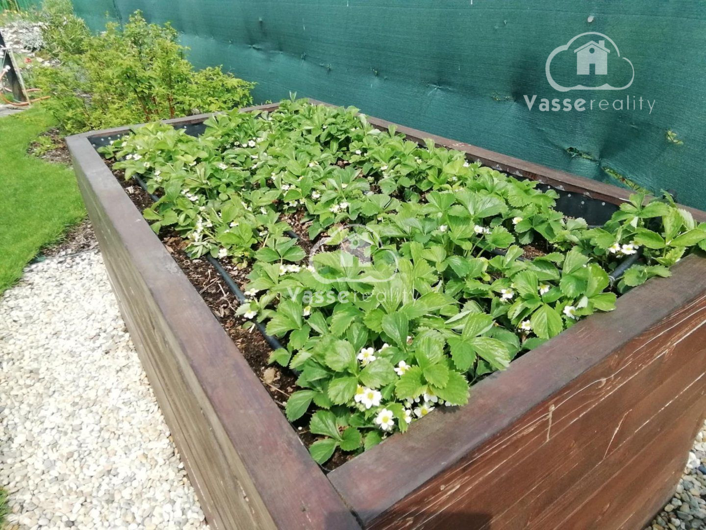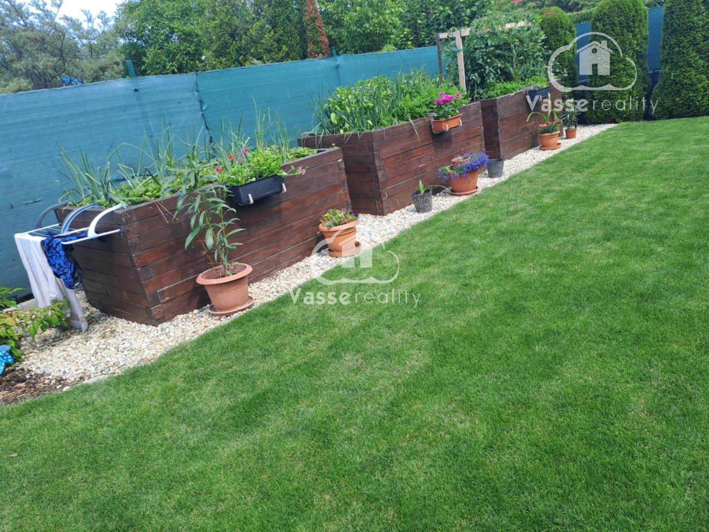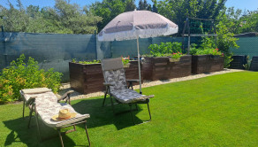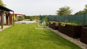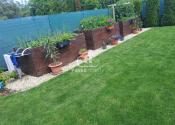 Záhrada je starostlivo udržiavaná, s okrasnými tujami a kvetinami . Na pestovanie zeleniny sú pripravené tri vyvýšené záhony, kde nájdete jahody, paradajky a papriku , mrkvu, petržlen ,cibuľa. Rastú tu ešte maliny, muchovník, ríbezle a egreš. Automatická závlaha s dažďovým senzorom sa stará o to, aby bola záhrada vždy v perfektnom stave. Pod trávnikom je aj sieťka proti krtkom .