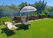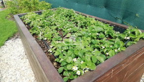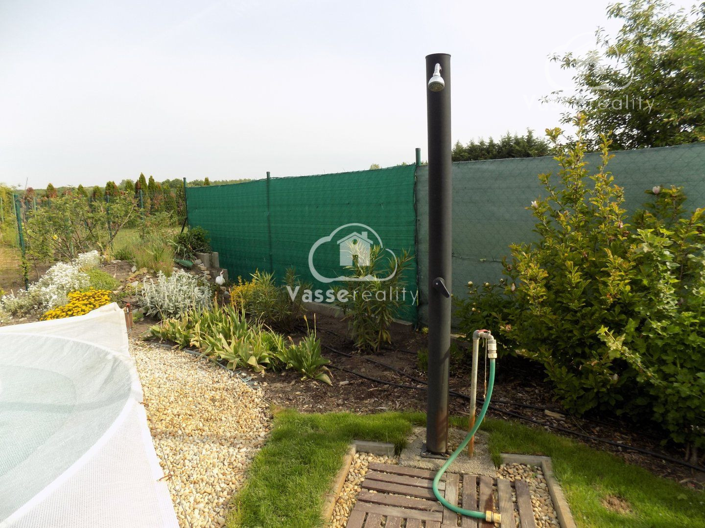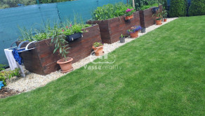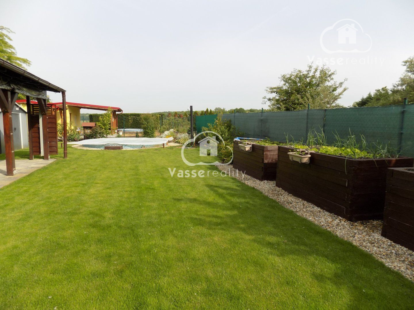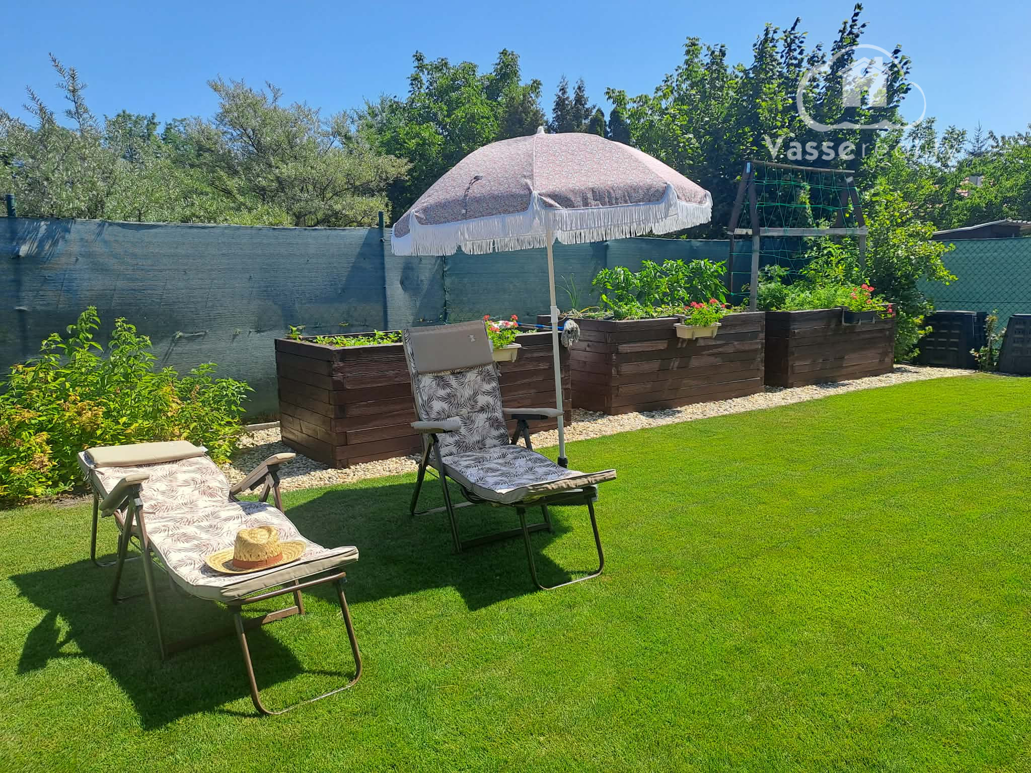 Záhrada je starostlivo udržiavaná, s okrasnými tujami a kvetinami . Na pestovanie zeleniny sú pripravené tri vyvýšené záhony, kde nájdete jahody, paradajky a papriku , mrkvu, petržlen ,cibuľa. Rastú tu ešte maliny, muchovník, ríbezle a egreš. Automatická závlaha s dažďovým senzorom sa stará o to, aby bola záhrada vždy v perfektnom stave. Pod trávnikom je aj sieťka proti krtkom .