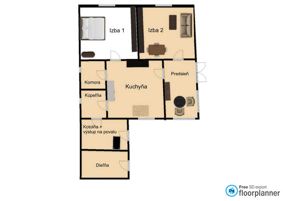 Dispozícia domu: vstupná hala, 2 izby, kuchyňa, komora, kúpeľňa, kotolňa, dielňa.
